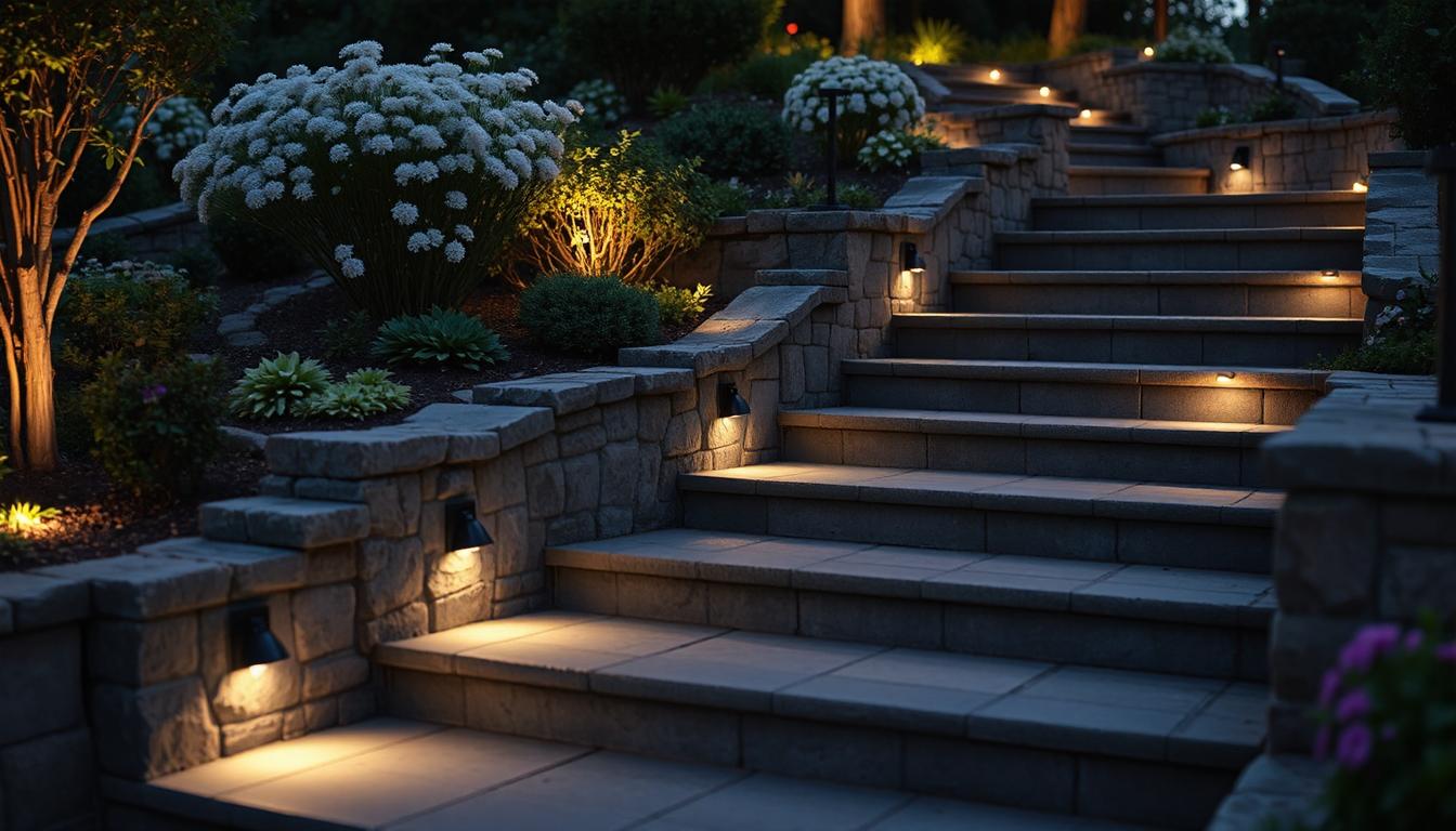 If you want something fancier, try small lights built into the edges of steps or stone paths. It looks stylish and helps everyone see clearly when walking around.