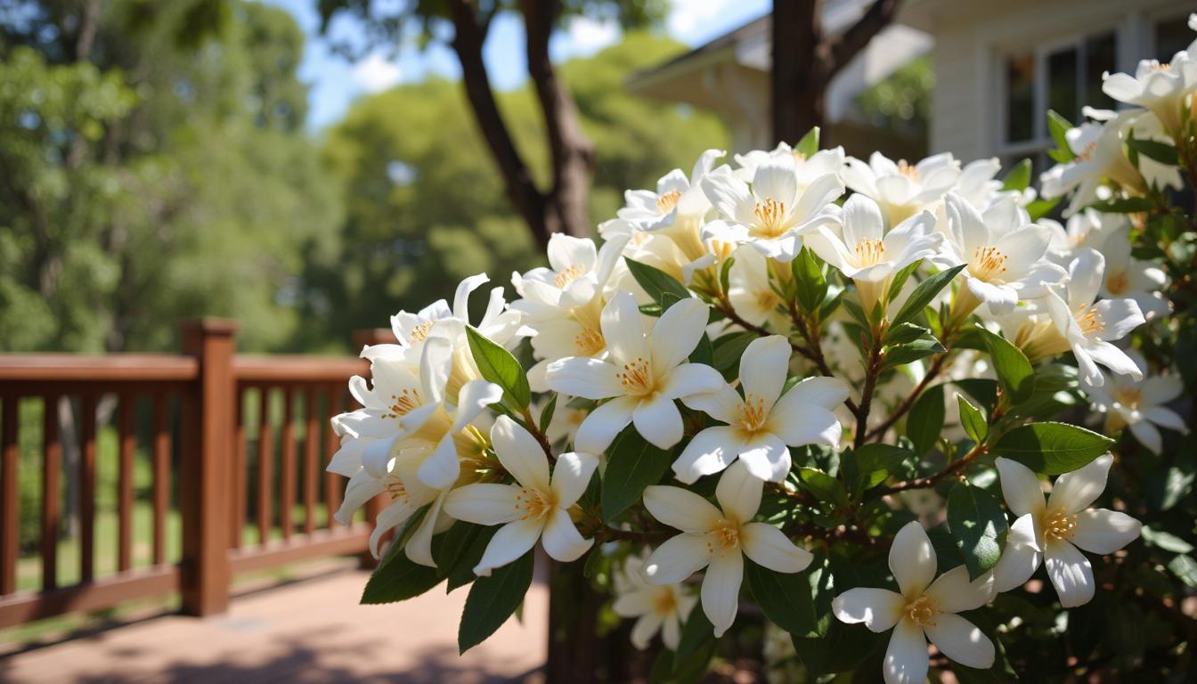This small tree or large shrub has glossy leaves and beautifully scented white flowers. The fragrance adds a tropical touch to your garden, and it looks good planted near outdoor living areas where you can enjoy its perfume.